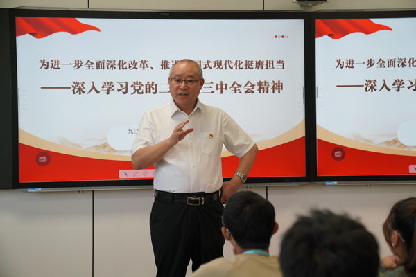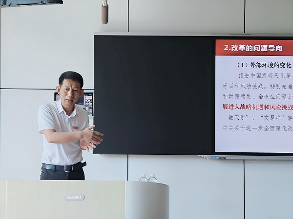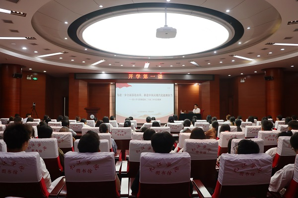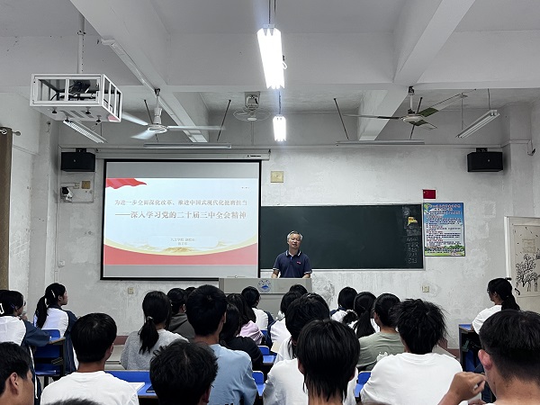 随后,李明斌为同学们讲授了题为《为进一步全面深化改革、推进中国式现代化挺膺担当——深入学习贯彻党的二十届三中全会精神》的第一课。他围绕“进一步全面深化改革、推进中国式现代化”的历史背景、战略部署、基本原则、重要意义及青年担当五个方面,旁征博引讲案例,深入浅出地阐明了“进一步全面深化改革、推进中国式现代化”的深刻内涵,引导同学们如何在强国建设的征途中成长为一个有信仰、敢担当、能吃苦、肯奋斗的社会主义建设者和接班人。