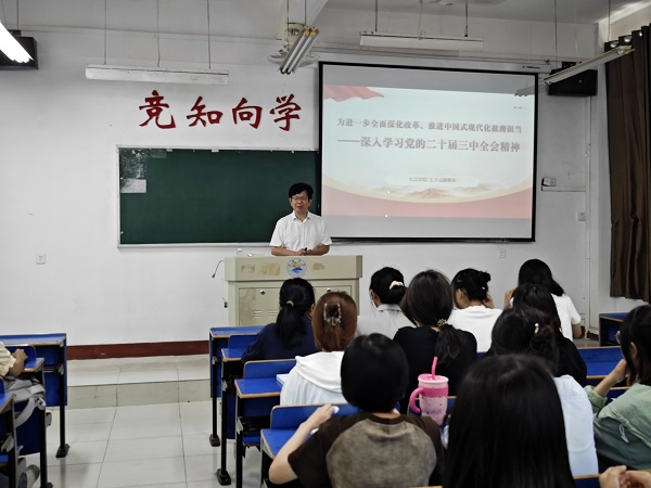 上午8点,校长陈小林走进立信楼404教室为管理学院A2431/32、A2421/22班同学讲授了开学第一课。陈小林深入阐释了党的二十届三中全会的主要内容与精神要义,勉励同学们将大会精神内化于心、外化于行,倍加珍惜美好的大学时光,树立正确的人生信仰,制定好大学生涯目标;学会改变学习方式,学思并重,致知穷理,力学笃行,知行合一,学会借助新工具提升学习效率;秉持“竞知向学,厚德笃行”的校训精神,逐梦九院,成就未来。