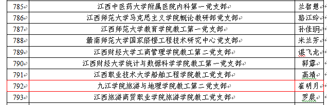 旅游与地理学院教工第二党支部作为全国党建工作样板支部和江西省首批党建工作样板支部,先后荣获全省教育系统“先进基层党组织”、九江市直机关工委“先进基层党组织”、九江市直单位“四强”党支部等多项荣誉。支部始终坚持党建与业务相融相促,深化党建工作与专业建设、学科发展、人才培养及社会服务的有机融合,积极打造“浔旅筑魂·头雁领航”党建品牌,在育人模式改革和地方经济服务方面不断探索,为学校发展贡献了积极力量。
