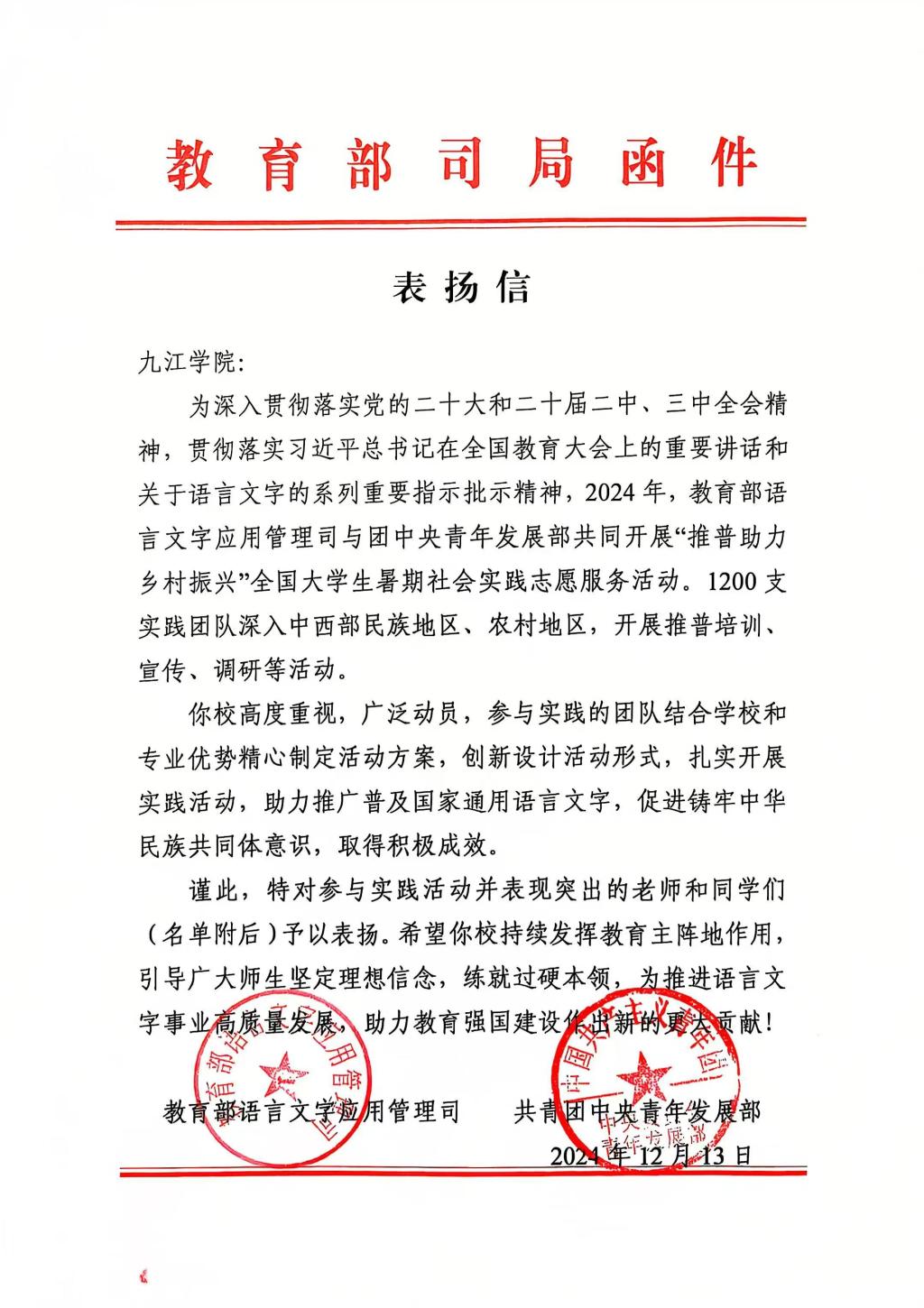 教育部和团中央在表扬信中对beat365官方网站“文小青”团队的优异表现给予高度评价,称赞他们在助力乡村振兴中展现了九院学子的青春担当,并希望学校继续发挥教育主阵地作用,坚定师生理想信念,强化社会实践能力,为国家语言文字事业高质量发展和教育强国建设作出更大贡献。
