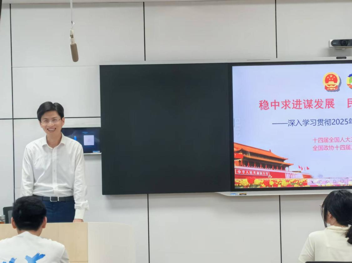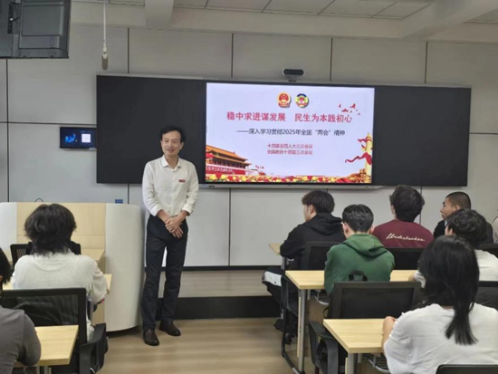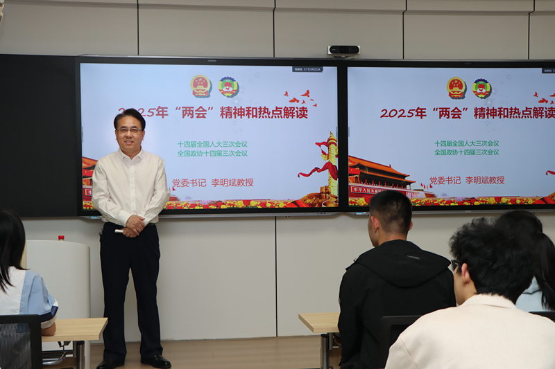 李明斌将两会精神与同学们的学习和生活紧密结合,内容丰富,精彩纷呈,不时引来同学们的阵阵掌声。他勉励同学们要以两会精神为指引,将自己的理想融入国家需求,让青春与时代“同频共振”,以“志气”锚定方向。两会释放的机遇呼唤青年敢为人先、敢于突破,同学们要以创新思维和实践行动,在“无人区”中开辟新路,在变革中定义自己的价值,以“锐气”突破边界。在课堂里积淀学识,在实践中锤炼本领,在挑战中磨砺品格,以专业知识和社会责任感为“底气”担当责任,努力成为伟大征程的参与者和创造者。