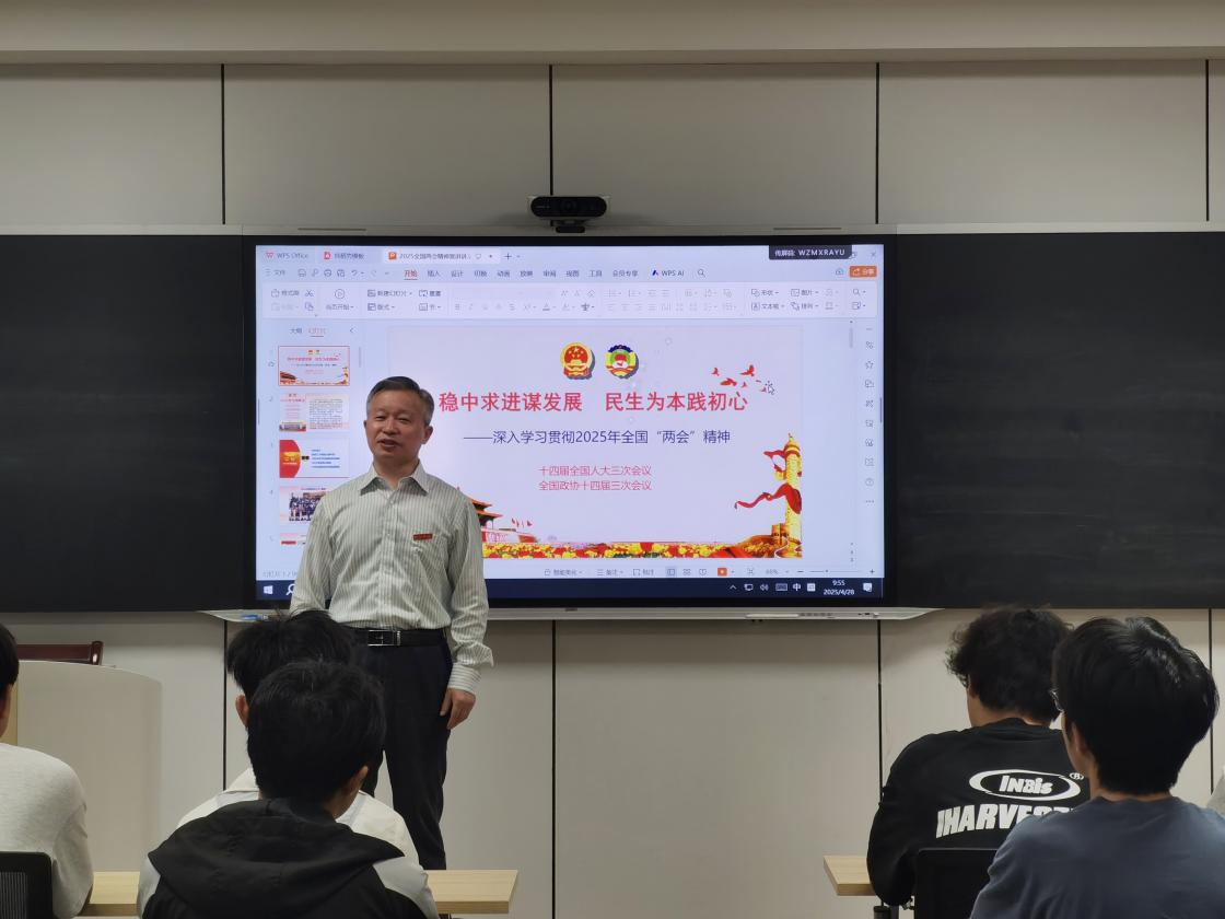 4月23日下午,校党委书记李明斌为法学院A2411班和管理学院A2432班学生讲授思政课。他以《2025年全国两会精神和热点解读》为题,从两会的历史沿革到年度报告要点,带领同学们深刻领悟新时代下国家发展的战略部署和青年成长成才的机遇与挑战。他勉励同学们不负时代,无愧初心,以理想为帆,以奋斗为舟,在全面建设社会主义现代化国家新征程上,书写属于我们青春的华美篇章。