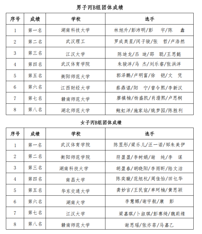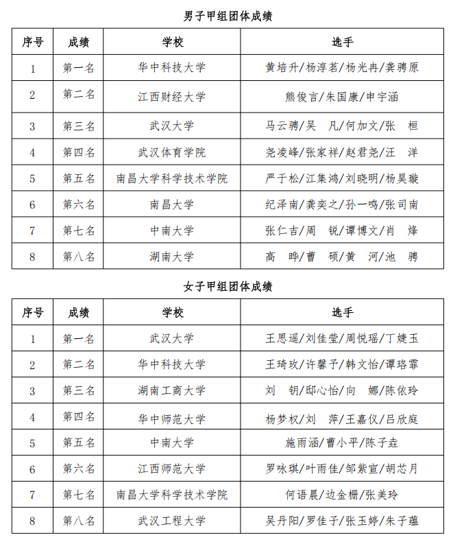 华中科技大学获得甲组男子团体冠军,武汉大学获得甲组女子团体冠军,湖南科技大学获得丙B组男子团体冠军,武汉体育学院获得丙B组女子团体冠军。武汉理工大学、beat365官方网站、武汉体育学院、武汉大学、南昌大学、中南大学获得体育道德风尚奖。