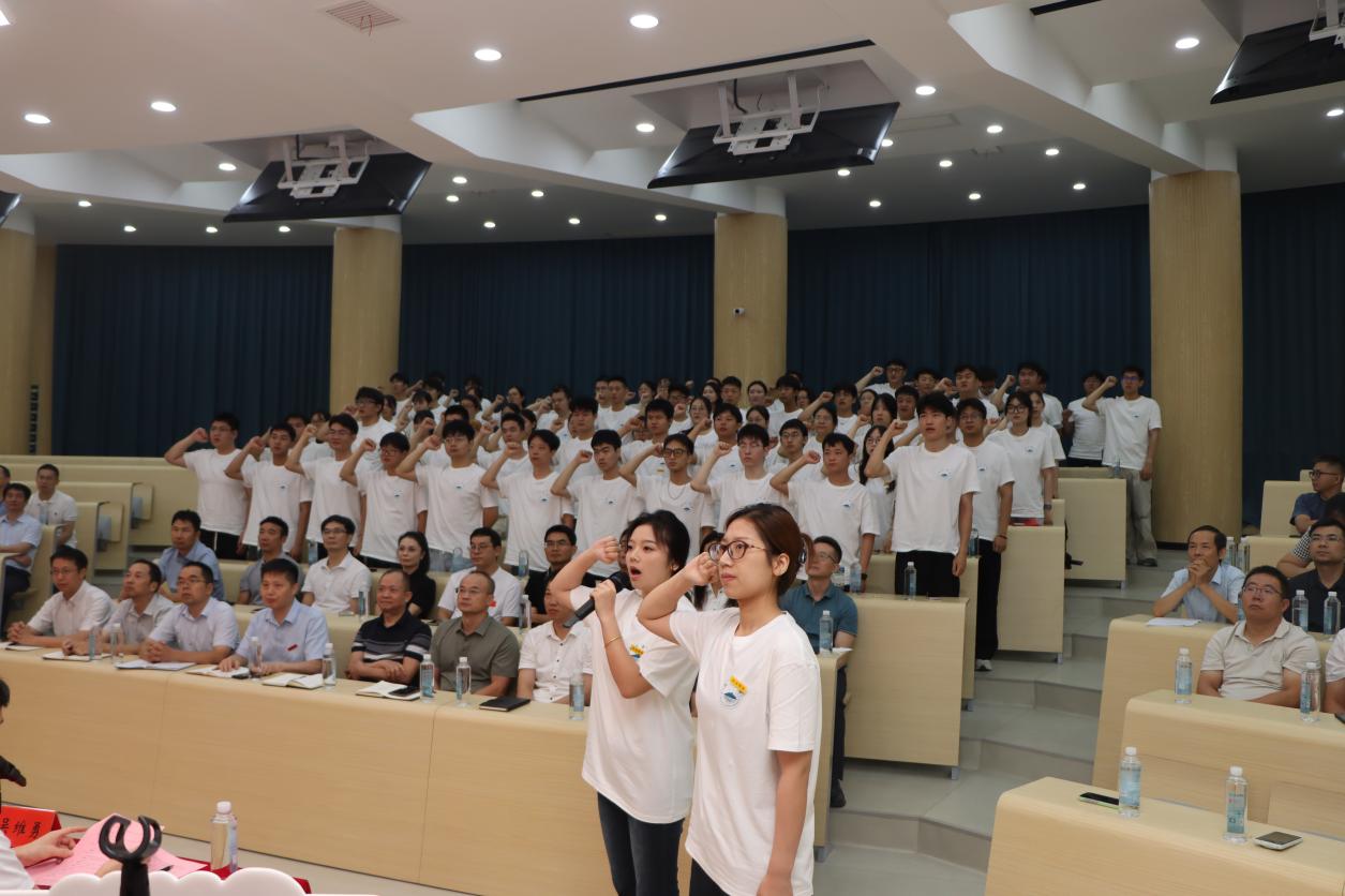 致辞结束后,校领导与发展规划与研究生处负责人为新生代表佩戴校牌。全体研究生起立,庄严宣誓,承诺恪守“竞知向学、厚德笃行”的校训,潜心钻研、勇担使命,以青春与智慧践行新时代beat365官方网站人的责任与担当。