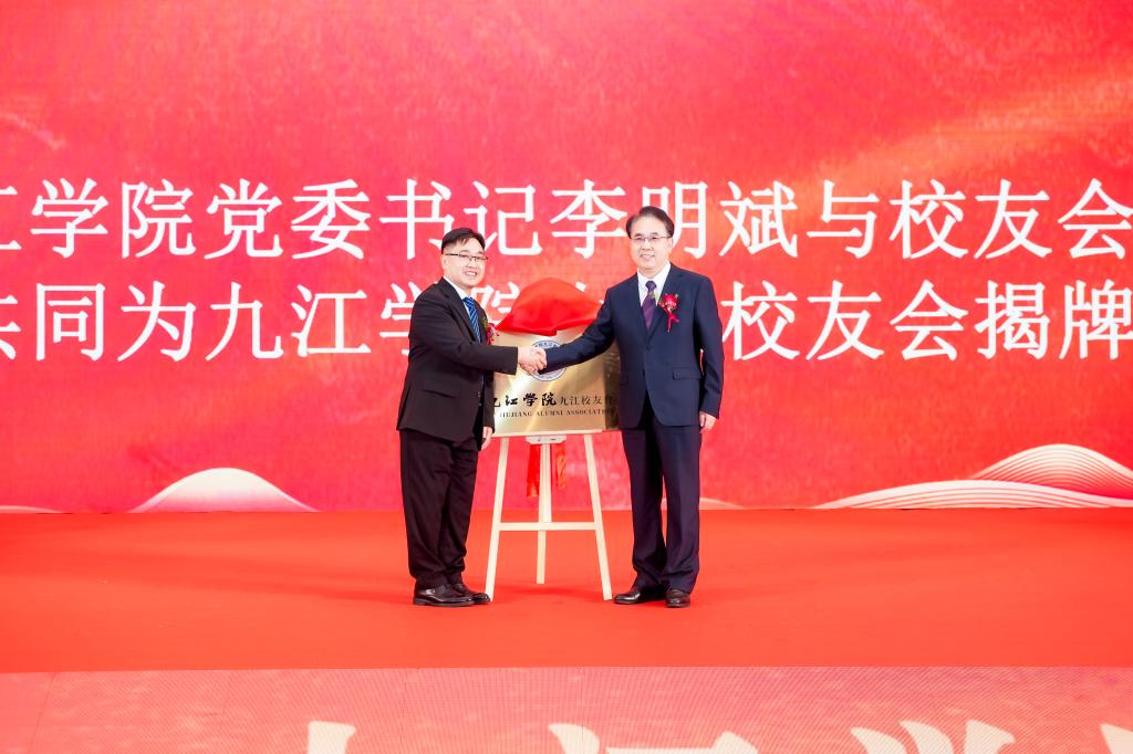 在全体嘉宾与校友的见证下,李明斌为首任会长胡甫晟颁发聘书,并共同为九江校友会揭牌。