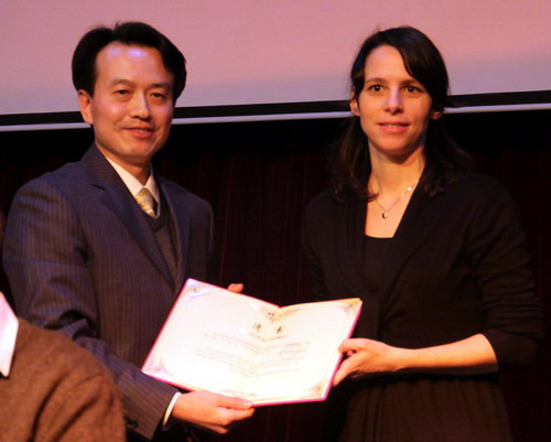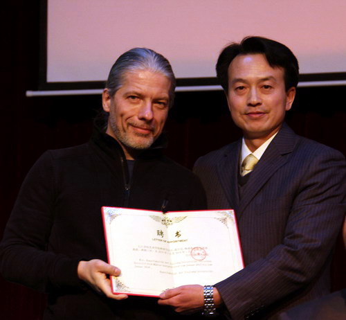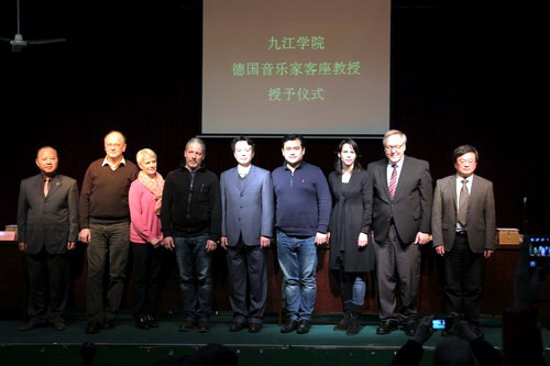 欧阳时来副院长首先简单介绍了来自德国音乐家团队每位成员的相关情况。接着,艺术学院院长吴维勇为德国音乐家团队颁发了聘书,党委书记王春生向德国音乐家团队赠送了礼品。
