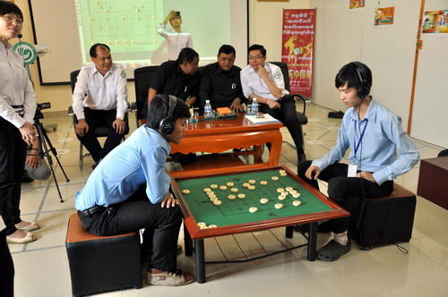 2月11日,柬埔寨王家研究院孔子学院芳华大楼多媒体放映室喜气洋洋,到处悬挂着喜气的灯笼,墙上张贴着春节风俗介绍,但最引人注目的是带置在地上的中国象棋大棋盘。孔子学院春节系列活动之中国象棋大赛庆新年在此隆重举行。柬埔寨国防部发展办公室副主任满强中将(MAM CHHEANG)和坦克军副总司令苏真格洒那中将(SOK CHANKRISSNA)作为特邀嘉宾出席了本次活动,孔子学院谢莫尼勒院长(CHEA MUNYRITH)、中方院长帅式毅、汉语教师志愿者及孔子学院学员约100人观摩了中国象棋大赛决赛。