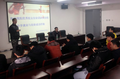 郭峰与创业团队主要成员之一曹杨斌一同返回母校,他们怀着三点希望。一是回来看望曾经为自己成长给予教育、帮助的领导和老师,感谢母校的培育;二是希望利用寒暑假等课余时间为学院贫困生提供一些勤工俭学岗位,同时也为学院学生提供职业能力培训的机会;三是为学院毕业生就业与创业提供一个学习与实践的平台。
