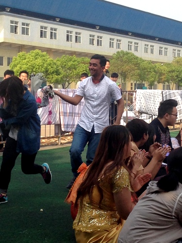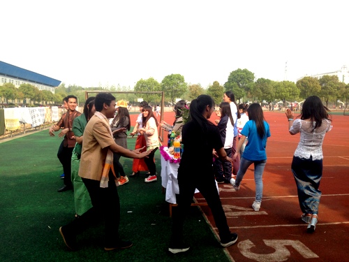 国际交流学院学生管理科科长何广代表国际交流学院送上新年祝福,并祝全体留学生身体健康,学习进步。柬埔寨学生范文丽和张小明用双语主持了这次活动,他们对现场的老师和同学表示了热烈欢迎,希望通过这个活动让同学们体会和感受柬埔寨传统文化。活动在轻松愉快的氛围中开始了,伴随着“难忘舞”的音乐,同学们一起参与到抢树枝、丢手绢等柬埔寨民间游戏和舞蹈中,现场欢声笑语不断。
