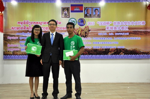 经过激烈的角逐,来自亚欧大学的江柏利用流利的汉语作的深情演讲、精彩的单口相声征服了评委获得了的冠军,他将代表柬埔寨参加于今年7月在长沙举行的“汉语桥”总决赛。 此次比赛二等奖的选手还将去中国观摩比赛,此奖项意旨在帮助更多的柬埔寨学生了解认识中国,鼓励更多的柬埔寨学生学习汉语。