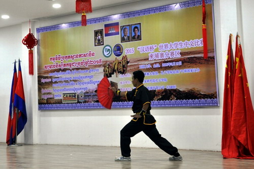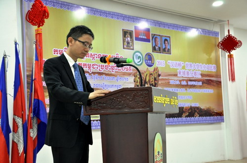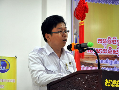 檀勍生参赞在致辞时说,“汉语桥”比赛是中柬两国友谊和文化交流的桥梁,希望参赛选手通过学习中文,更好地了解中国悠久的历史和文化,承担增进中柬两国友谊与合作的重任,为两国人民友好交流作出贡献。当前,中国政府正在大力推动“丝绸之路经济带”和“21世纪海上丝绸之路”。我们简称“一带一路”倡议。民心相通是我们建设“一带一路”的社会基础。而中文则是实现民心相通的重要媒介。我们希望各位老师和同学能积极学习中文,了解中国文化,为推动双方的文化交流做出贡献。中国使馆和孔子学院也将继续为各位学习中文和中国文化,提供各种服务和便利。