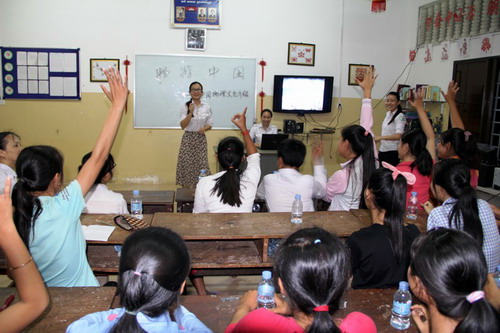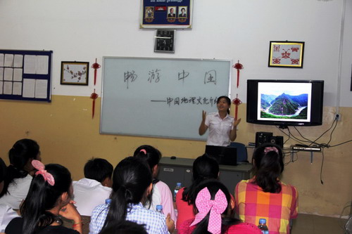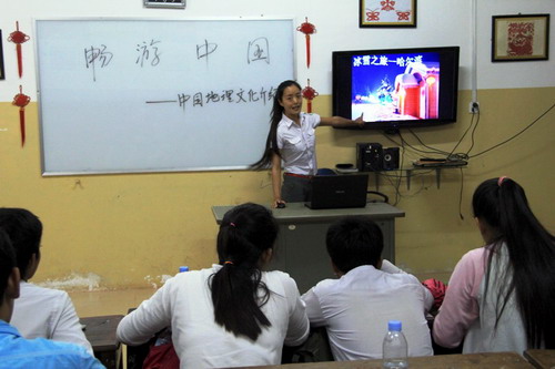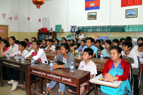 8日下午,细雨绵绵,但挡不住学生们参加活动的热情,大家如期到达吴哥高中孔子课堂。孔子课堂的各位教师按照地理方位,从地理和人文两个方面向学生们介绍了杭州、西藏、哈尔滨、桂林和庐山等五个中国著名景点的有关情况。教师们通过图片、音频、视频等多种方式全面系统而又简明扼要地对学生们进行讲解,拉近了师生间的距离,有效地促进了师生间的互动。很多学生不断举手争相询问、回答问题。整个活动气氛热烈而融洽。