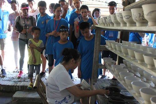 炎炎夏日,营员们来到景德镇古窑,感受中国千年陶瓷文化。临近古窑时,张导游介绍瓷器的特点:“白如玉,明如镜,薄如纸,声如磬”大家参观了历代古窑,了解和欣赏了古代瓷业建筑,明清时期景德镇手工制瓷的工艺过程以及传统名瓷精品。瓷乐的展示也吸引了各位营员和领队,清脆细腻不烦耳,百听不腻。大家也逛了瓷街和大大小小的产品店,都为陶瓷工艺所震撼,原来生活中经常出现的商品,都可以用陶瓷制成,精巧漂亮,大家进一步加深对陶瓷文化的了解。