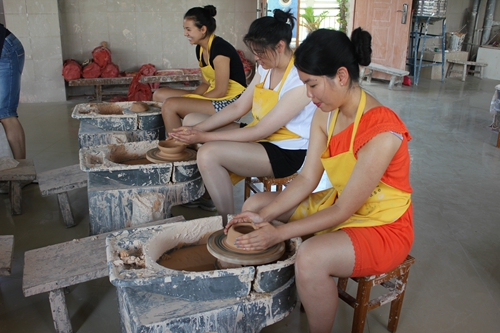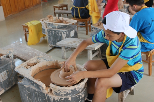 陶艺体验当然也是学习陶瓷文化必不可少的环节。27日,大家来到陶瓷体验区,在观看陶瓷大师制瓷时,营员们都纷纷表示道:“这是一个简单的活,只是捏一捏,拉一拉就行了”。但是当来到体验区,大家坐到坯土面前都显得手足无措。营员们分成两组,认真听老师讲解的同时,自己也开始动手做,毕竟是第一次,大家都略显生疏,有些营员还会把泥土溅出来,可是时间久了,部分同学掌握了诀窍,在老师的帮助下,做出来的碗盘、碟子等等,还有模有样。但是也有些同学做的样子不太好看,略有失望同时也不舍不弃。营员们还进行了捏土、画坯的体验,有些同学捏出了很多卡通人物和动物,有些同学在盘子上画出各种各样的花型和玩偶。在短暂的时间里,大家积极参与,最后离开时,还带着恋恋不舍的心情,表示下次有机会过来,还要体验一把。