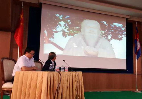 谢莫尼勒介绍了孔子学院发展与留学中国的汉语考试,播放了《十分钟看懂中国》宣传片,视频从人口、宗教、政治、历史、语言文字、经济、教育以及饮食文化等方方面面详细地介绍了当代中国,令与会人员迅速了解中国全貌。其后的柬埔寨王家研究院孔子学院6周年宣传片,从孔子学院的成立历史、取得的丰硕成果以及具体的办学条件和师资力量等方面进行介绍,令人一目了然。