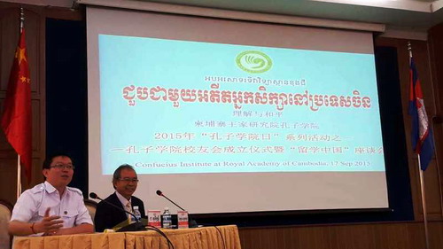 9月17日,由柬埔寨王家研究院孔子学院主办的柬埔寨孔子学院校友会成立仪式暨“留学中国”座谈会在王家研究院礼堂举行,这是2015年“孔子学院日”的系列活动。柬埔寨教育青年体育部文化关系及奖学金司司长恰索朋先生(Mr. Chap Sophorn),总理府内阁办公厅人事局副局长斯维娜丽女士(Ms. Svay Nakry,对外经济贸易大学留学),劳工部副秘书长得成功阁下(H.E. Tes Rukhaphal清华大学公共管理硕士),王家研究院顾问翁奔阁下(H.E. Oum Pom, Minister)出席并讲话,中国驻柬埔寨大使馆文化处负责人韩静女士作为特约嘉宾出席并介绍留学中国中国政府奖学金项目。座谈会由孔子学院院长谢莫尼勒阁下(H.E. Chea Munyrith)主持。