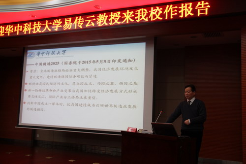 讲座中,易教授首先以其渊博的知识和丰富的卓见详细讲述了我国机械制造业发展史,从战国时期到鸦片战争,从古代制造业发展到现代机械制造技术,易教授全面系统的讲解让在座师生感受到机械技术的发展给社会生活带来的变化,同时看到我国机械制造业与世界强国之间的差距。接着,易教授阐述了国务院2015年公布的《中国制造2025》国家战略规划。其中,他深入解读了《中国制造2025》出台的历史背景和意义、基本方针和基本原则、战略目标和任务以及国家大力推动重点领域突破发展的方向,建议大家要适应、跟踪国家重大战略调整目标,明确自己的发展方向,为祖国制造业的发展和中国梦的实现贡献出自己的一份力。