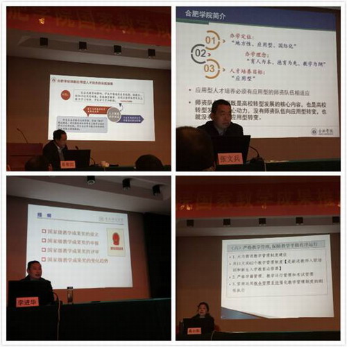 会上,合肥学院党委书记蔡敬民做了《应用型人才培养模式改革》、合肥学院校长张文兵做了《应用型本科高校师资队伍建设》、电子系谭敏教授做了《应用型本科第二课堂教育教学模式改革》、计科系许强教授做了《应用型本科模块课程与教学方法改革》、合肥师范学院校长李进华做了《国家教学成果的设立及评审程序》专题讲座,赣南师范学院教务处副处长高小华介绍了赣南师范学院在教学管理上的具体举措。培训期间,培训班学院还参观了合肥学院电子和计算机系的实验室。