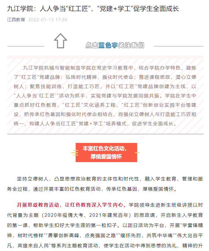 学院强化“红工匠”党建品牌建设,在全院倡导形成了“人人争当红工匠”的“党建+”效应:教师围绕这个目标来教,强化教风,打造精品;学生围绕这个目标来学,强化学风,追求卓越;行政人员围绕这个目标来服务,强化作风,精益求精。获批校级党建工作样板支部、四强党支部、双带头人工作室、“红工匠”党建品牌。不断探索“党建+”特色育人模式,获批“多彩匠心”辅导员工作室和“红色班级”,通过专思融合育匠魂,涵育“红工匠”精神;课赛融合育匠技,增强专业实践技能;产教融合育匠才,提升工程实践能力。不断强化人才培养质量,《构建人人争当红工匠“党建+学工”育人模式,促进学生全面成长》在全校“党建+”优秀案例评比中获得一等奖。《中国教育》“红工匠精神结硕果,机械学院考研亮点纷呈”、《人民日报》“把红字写在‘三下乡’的路上”、《学习强国》“红工匠精神结硕果”等多篇报道展示了学院学生红工匠精神培养成果。