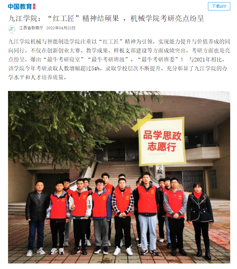 2022年,在大学生机械创新设计大赛上取得历史最好成绩,共获得国家级一等奖3项、三等奖1项,排名全国高校第六名;江西赛区中荣获一等奖9项、二等奖3项,获得团体总分第一名。在全国大学生先进成图技术与产品信息建模创新大赛共获得国家级奖励10项。