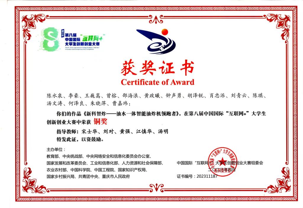 2023年,学科竞赛取得新突破,在“互联网+”大学生创新创业大赛中获得国家级铜奖2项,省赛中获得银奖、铜奖各1项;在大学生工程实践与创新能力大赛中获得国赛金奖3项、银奖3项,省赛获得一等奖6项、二等奖1项;在中国大学生机械工程创新创意大赛中获得全国总决赛一等奖1项、二等奖4项,获得省赛一等奖1项、二等奖4项、三等奖4项;在全国大学生先进成图技术与产品信息建模创新大赛中获得团体二等奖1项、单项奖15项。
