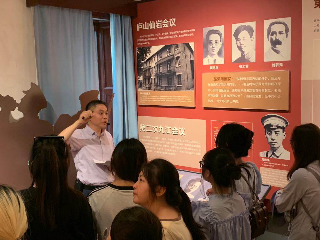 在纪念馆内,余建明结合《中国近现代史纲要》课程第七专题内容及纪念馆的陈设,详细讲解了八一南昌起义在九江策源谋划的真实历史过程。他利用革命文物和纪念馆的陈设,将抽象的历史知识具象化,使学生们能够更直观地感受那段波澜壮阔的岁月。授课过程中,余老师还针对现场内容进行了提问,引导学生们深入思考。