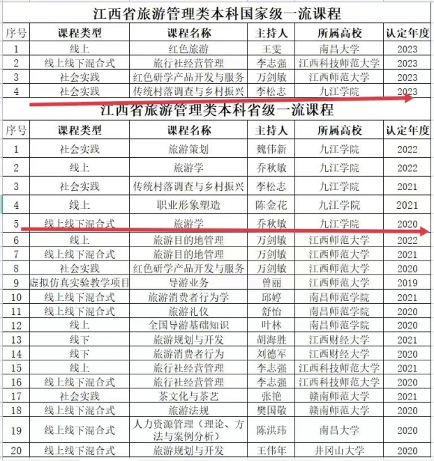 学院旅游管理专业获批国家级一流本科专业,“传统村落调查与乡村振兴”课程被教育部认定为第二批国家级一流本科课程。先后有2门课程入选教育部旅游专业应用课程改革创新案例库,1门研学课程获江西省优秀研学课程,7门课程获得省级一流课程的立项,7门课程获得校级一流课程的立项,2门课程获校级课程思政示范课程立项。旅游管理教学团队获批江西省高水平本科教学团队,学院共获省级教学成果二等奖1项,校级教学成果奖一等奖3项、二等奖3项。共立项国家级课题6项、教育部人文社会科学项目1项、省部级课题及项目22项、市厅级项目9项,公开发表论文60余篇,出版专著8部,发明专利31项。