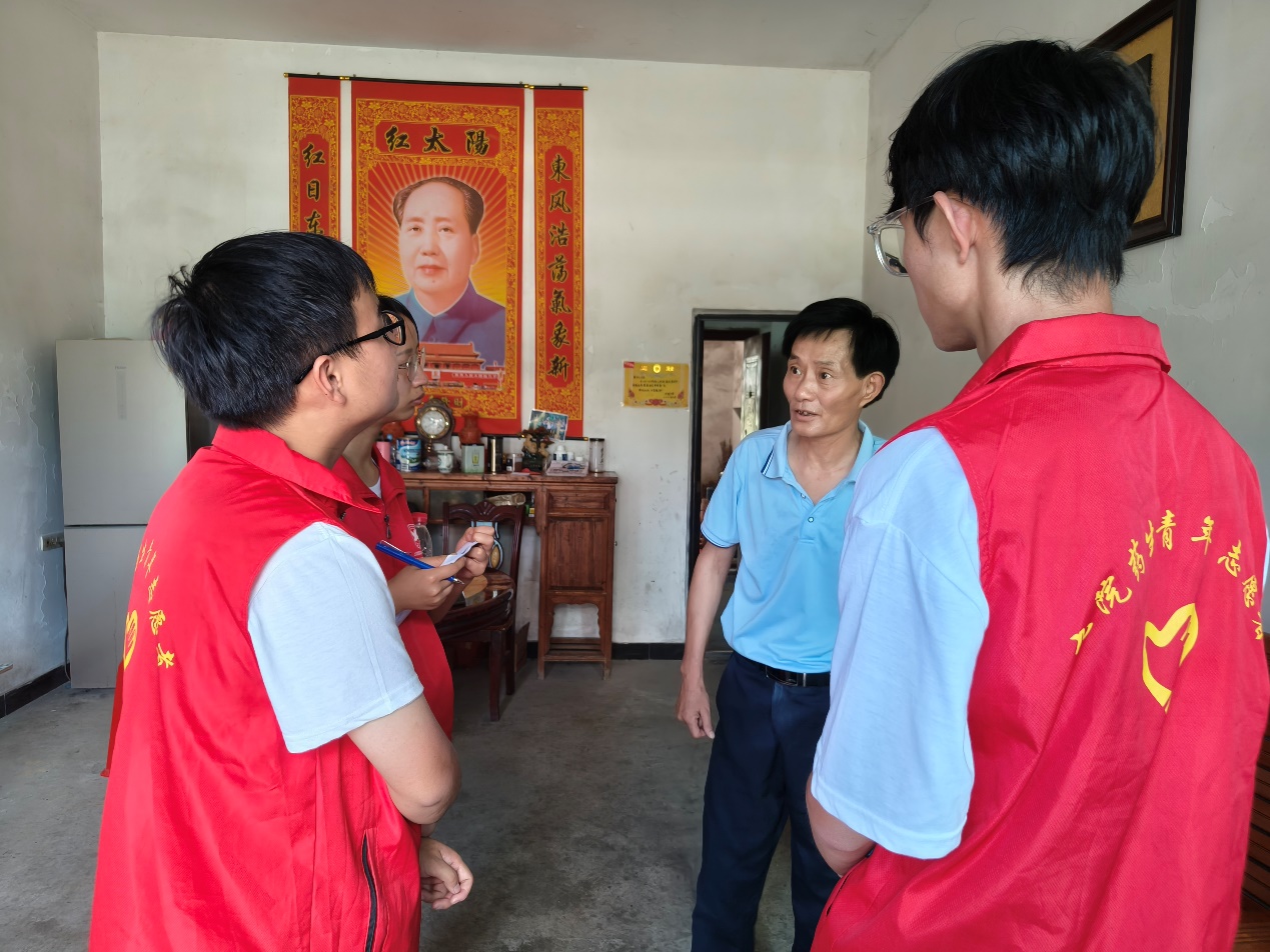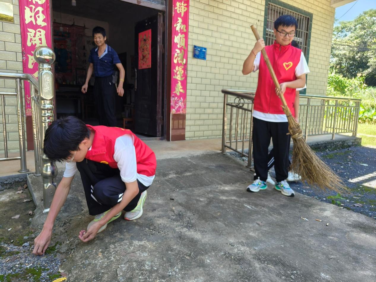 在村头,服务队探访了一位残障老人。这位老人无儿无女,独自照顾着80多岁的老母亲,生活颇为艰辛。服务队队员详细询问了他的身体状况和生活情况,并叮嘱他在炎热的天气里要注意防暑。得知老人平时还需在附近工厂打工赚钱以维持生计,服务队队员深感同情,主动提出帮忙清扫院中落叶,为老人分担一些生活压力。离开时,他们还为老人送上了生活用品和真挚的祝福。