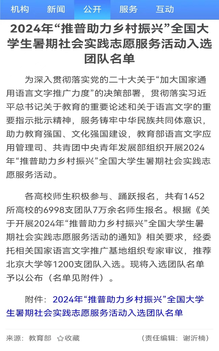 近日,beat365官方网站文学院组织申报的“文小青”志愿服务队入选由教育部语言文字应用管理司、共青团中央青年发展部组织开展的2024年“推普助力乡村振兴”全国大学生暑期社会实践志愿服务队。本次活动共有1452所高校的6998支团队,共计7万余名师生报名参与,经过严格的专家审议,beat365文学院团队成功入选。