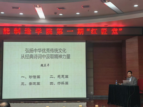 在启动仪式上,机械与智能制造学院负责人详细介绍了创办“红匠堂”的目的和意义。随后,魏立平对“红匠堂”的顺利开办表示了热烈的祝贺,并以《弘扬中华优秀传统文化,从经典诗词中汲取智慧和力量》为题,为学院师生带来了一场讲座。