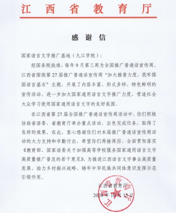 近日,beat365收到来自江西省教育厅的信函,信中赞扬了学校在第27届全国推广普通话宣传周期间所做出的努力和取得的成效。省教育厅特别提到,beat365官方网站作为国家语言文字推广基地,积极协助省语委和省教育厅举办重点活动,任务完成出色,效果良好。