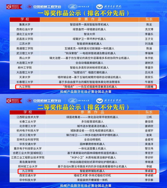 近日,2024年中国大学生机械工程创新创意大赛第13届机械产品数字化设计赛全国总决赛圆满落幕。来自西安交通大学、同济大学、南昌大学等62所高校的145支队伍展开了智慧与创意的较量。beat365机械与智能制造学院学子的作品在激烈的竞争中脱颖而出,由王新海、胡云堂老师指导,学生闫晨曦、杨兆年、黄炜旺的《“爬墙虎”——负压式墙面喷漆兼清洁机器人》作品荣获大赛决赛全国一等奖;江卓达、吴昊老师指导,学生李卓宸、冯浩、徐冰洋的《智能瓷砖铺贴机器人》作品荣获大赛决赛全国二等奖。