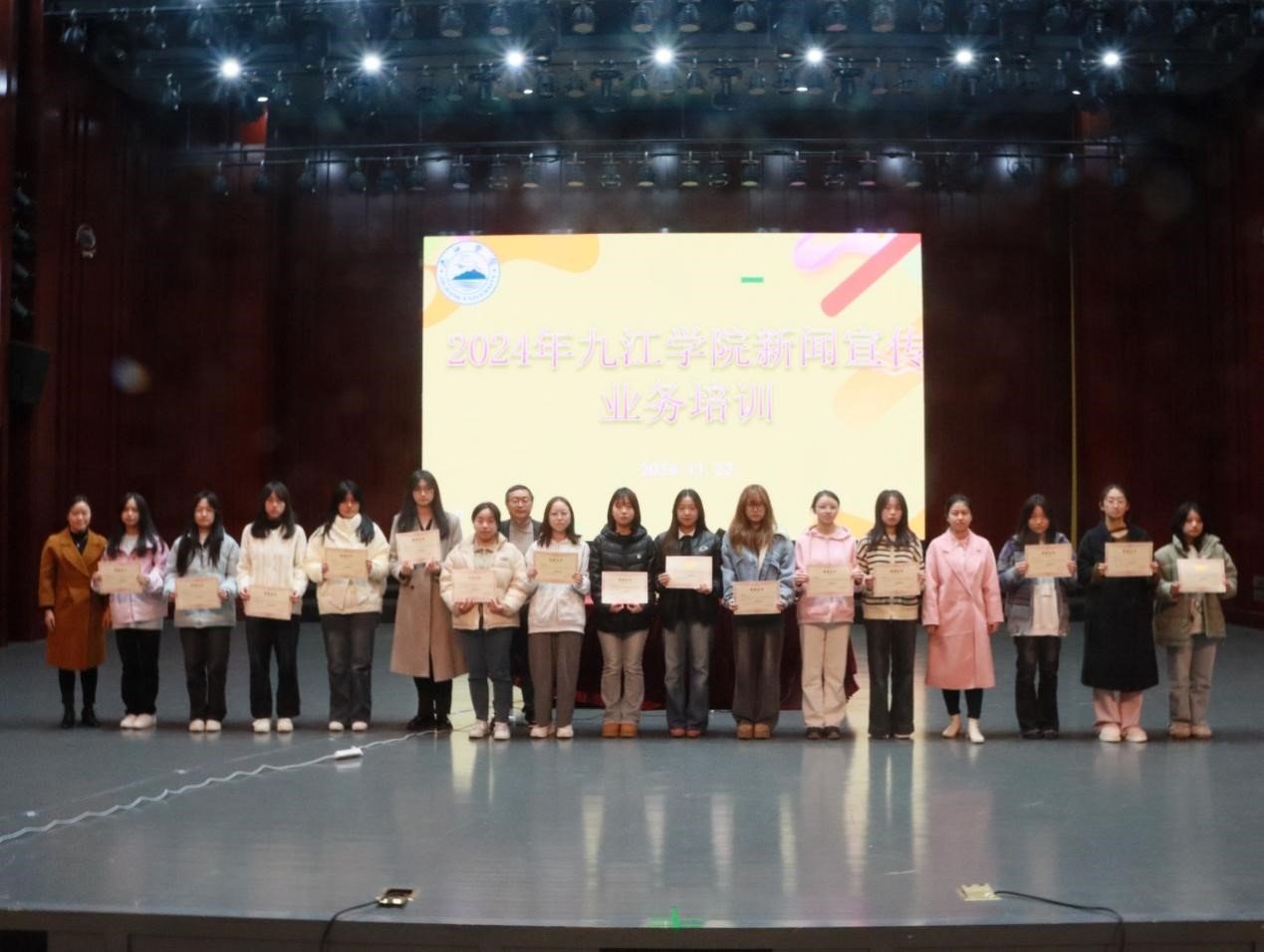 27日下午,培训结束后,学校大学生新闻中心进行了2024年新闻宣传业务培训结班式暨表彰大会。会议对本次培训工作进行了总结,并表彰了2023-2024学年大学生新闻中心先进个人及培训班优秀学员。文学院A2461班骆颖同学在会上作为优秀学员代表发言,表达了对培训的感悟和对未来工作的信心。