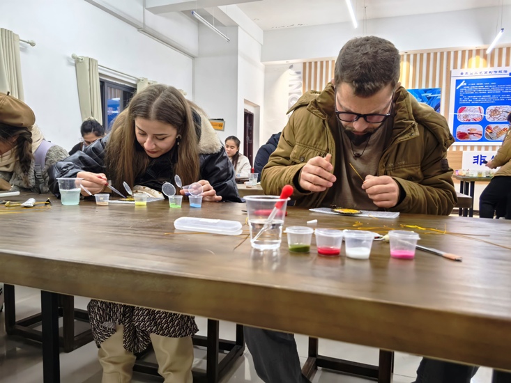 活动当天,国际学生们积极参与了多项非遗技艺的体验活动。在万里茶道学院,他们沉浸在袅袅茶香之中,学习并体验了茶艺、果茶和奶茶的制作工艺,深刻感受到了中国传统茶文化的深厚底蕴。在陶瓷技艺展示区,学生们亲手触摸泥土,在指导老师的悉心教导下,尝试制作陶瓷作品,见证了从泥土到精美器具的神奇转变。而在扎染技艺的环节中,他们更是亲眼目睹了普通布料如何在扎染工艺下,摇身一变成为绚丽多彩的艺术品,并亲手创作出了属于自己的扎染作品,深切体会到了传统染色技法的独特魅力。