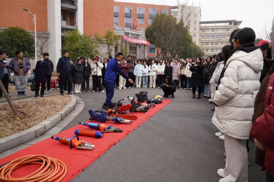 濂溪区消防救援大队的消防员们在第一时间抵达现场,迅速展开灭火救援行动。他们熟练地操作消防设备,展示了高超的专业技能:高压水枪精准扑向着火点,瞬间压制火势;消防员们还同步进行了登高梯救援、担架救护等实战科目演示,让师生们近距离感受消防工作的艰辛与专业,现场不时响起阵阵惊叹与掌声。