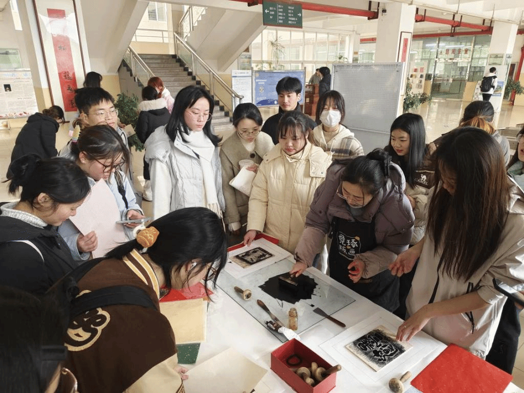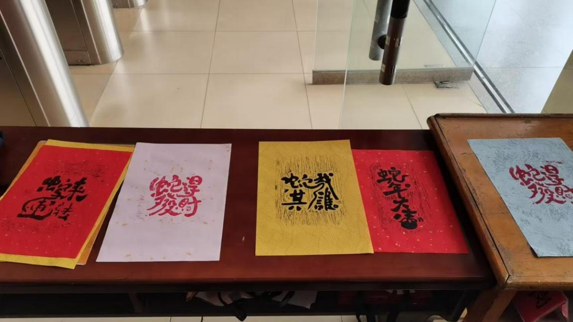 活动现场,在图书馆老师的指导下,师生们挑选彩纸、涂墨、拓印,亲身感受了非遗技艺的独特魅力。一幅幅以“乙巳蛇年”为主题的祝福版画栩栩如生,既有传统年画的吉祥寓意,又融入了现代设计元素,展现出传统艺术焕新的生命力。