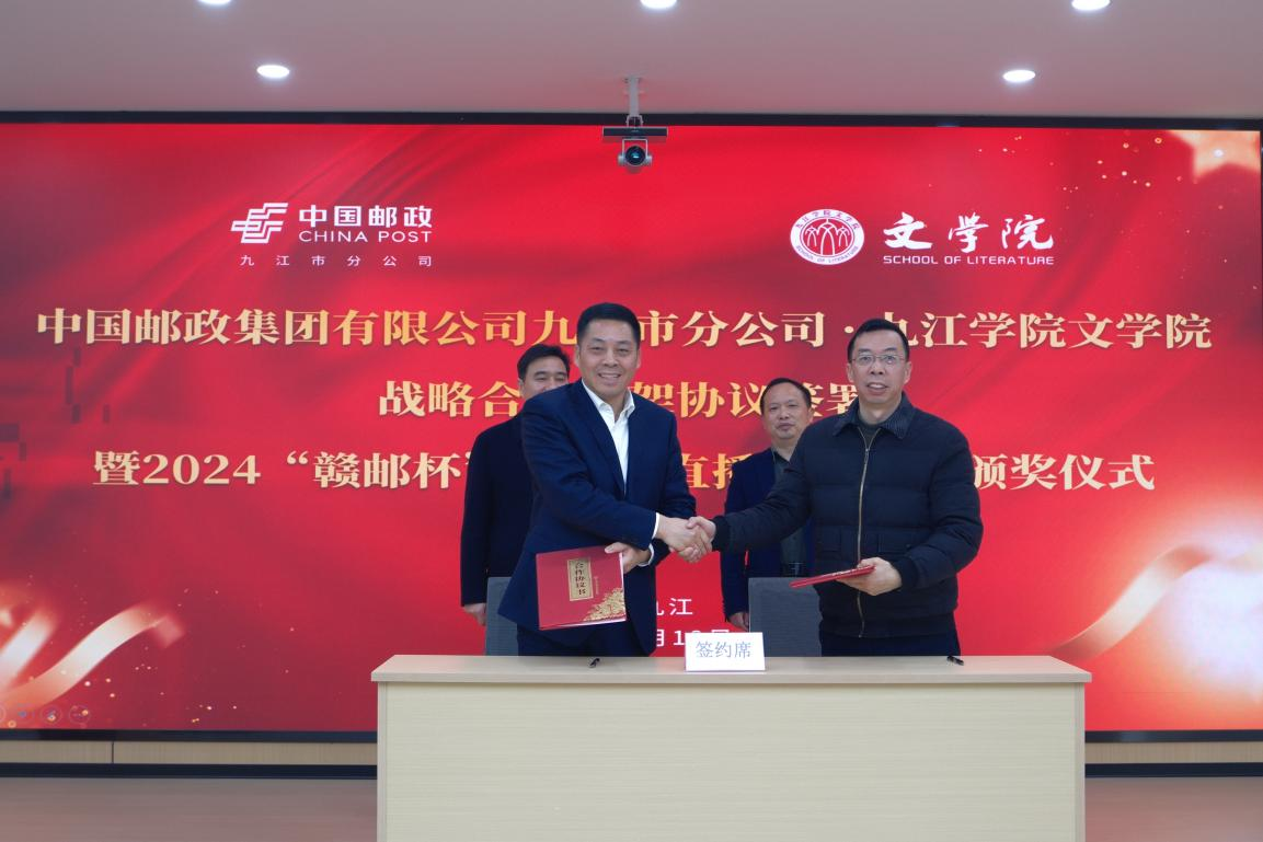 签约仪式上,文学院与中国邮政九江市分公司签署战略合作协议。根据协议内容,双方将在主题邮局建设、文化创意开发、直播电商实践基地共建等领域展开深度合作。