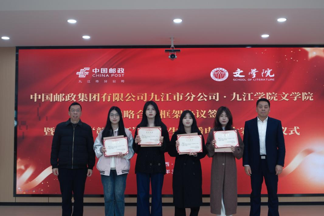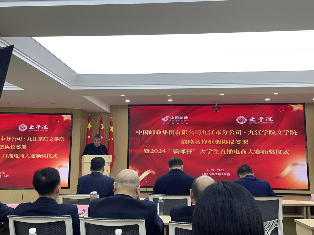 3月19日上午,中国邮政集团有限公司九江市分公司与文学院战略合作协议签署仪式暨2024 “赣邮杯”大学生直播电商大赛颁奖仪式,在中国邮政九江市分公司会议室举行。此次活动聚焦深化校企合作,旨在推动直播电商、文创等领域的产教融合,为地方文化经济发展注入全新动力。