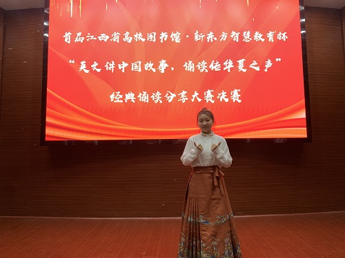 二等奖获得者、文学院祝彦昕同学以“传承文化,共舞传统”为主题,讲述了南昌大学赣剧欣赏课的故事,展现了当代大学生对传统文化的热爱与传承。她用流利的英语和生动的表达,将中国传统文化的魅力展现得淋漓尽致。