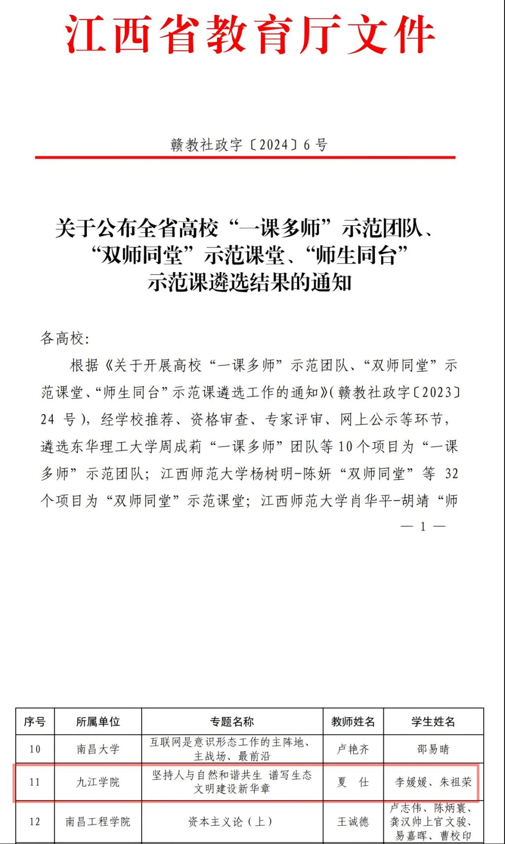 学院围绕课程建设,践行OBE教学理念,开展教育教学改革。学院坚持开门办思政课,强化问题意识,突出实践导向,充分调动全社会力量和资源,建设“大课堂”、搭建“大平台”、建好“大师资”,设立实践教学基地,推出优质教学资源,做优品牌示范活动,推动思政小课堂与社会大课堂相结合。学院注重思政课改革创新,全力推动了“问题式专题化团队教学改革”,成效显著。学院获批全省高校思政课教学改革创新团队1个、全省大中小学思政课一体化共同体1个、全省“家门口”大思政实践教学基地2个。江西省高校人文社会科学重点研究基地“beat365官方网站社会系统学研究中心”挂靠在马克思主义学院,成立“九江红色文化研究中心”,开设“红色经典影视赏析”“看电影,品社会与人生”“大学生身心健康调适技巧”等特色课程。