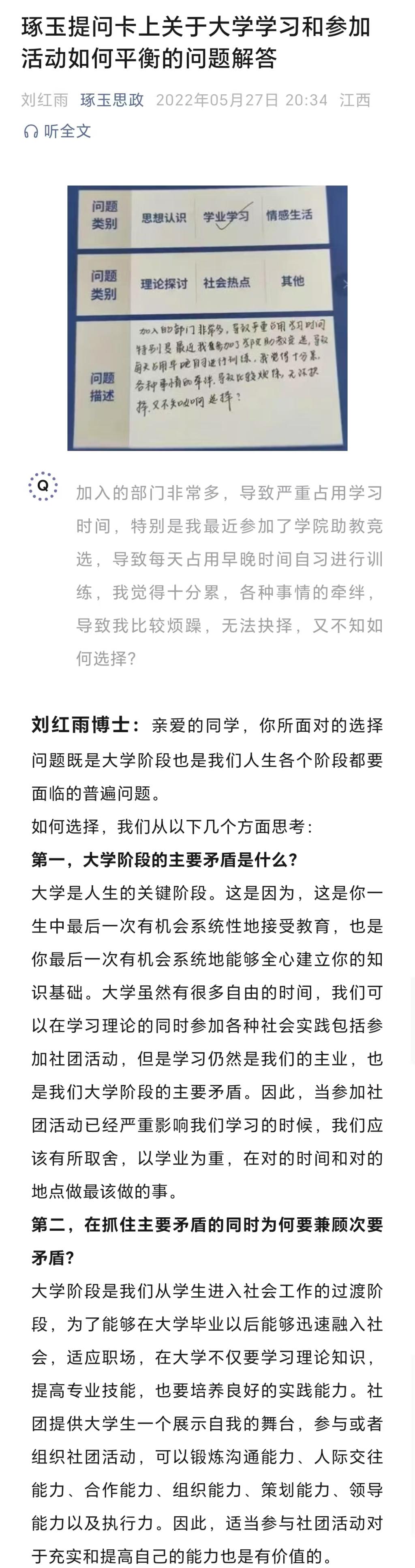 答·“青春之问”。通过微信公众号和“青春之问”专用邮箱收集学生中普遍存在的思想困惑、学习问题等,疏导学生关于学习、生活、社交、恋爱等方面的“小疑虑”及“小障碍”。