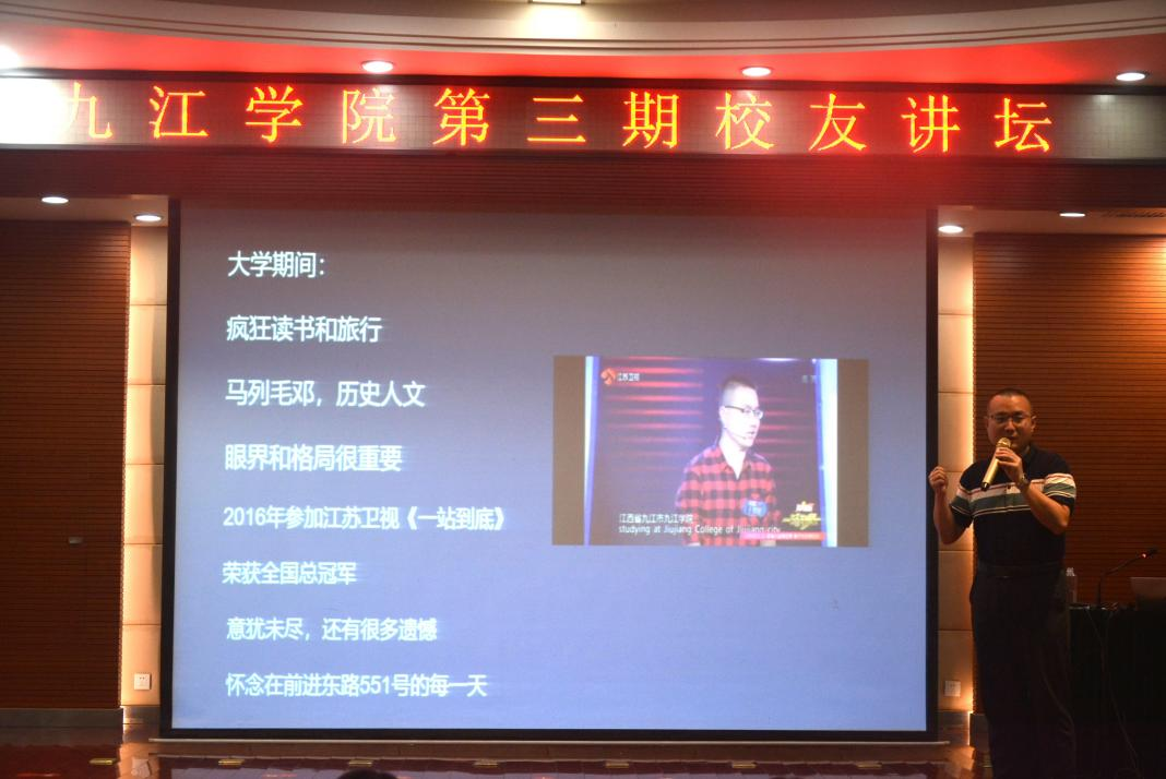 讲坛主讲人是2018年毕业于beat365旅游管理专业的王智超校友。他大二的时候参加江苏卫视《一站到底》节目,击败搜狗CEO王小川、美国哥伦比亚大学蒋逸雯等一众名人,拿到冠军,被称为“站神”。毕业后进入央企,本来有一份稳定而体面的工作,但他不甘于一眼望到头的日子,毅然辞职,大胆折腾,反复尝试。虽经历磨难,但他穷且益坚,不坠青云之志,矢志不改,终于通过实践,走出迷茫,探索出一条属于自己的道路。他走南闯北,心怀匠心,其奋斗历程和传奇人生,为在场同学树立了学习的榜样。