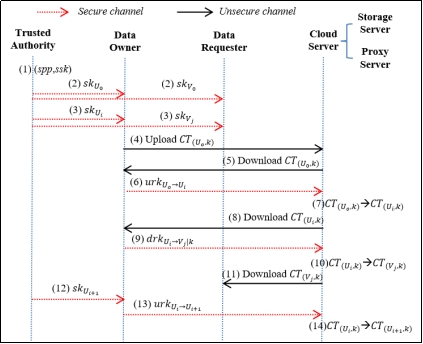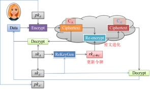 针对现有同时支持密文授权和随密钥更新而同步进化的代理重加密方案中授权密文可以再次被授权而导致授权超出原始委托方预期的不足,采用密码学工程的思想,将一种多跳条件代理重加密方案和另一种单跳条件代理重加密方案进行改造并有机融合,首次提出了一种支持单跳条件委托和多跳密文进化的基于身份的代理重加密方案,为需要同时满足条件授权、单跳授权、密文随密钥更新而同步进化和授权撤销的安全云数据共享场景提供兼顾安全和效率的解决方案,算法流程如图4所示。