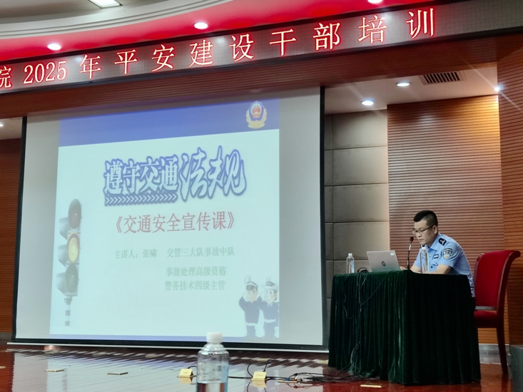 在交通安全培训环节,张啸紧密结合校园周边交通环境与学生出行特点,讲解了交通安全法规,列举了常见的交通违法行为及其潜在危害,通过展示交通事故图片与警示视频,以触目惊心的画面让参训人员深刻认识到遵守交通规则的重要性。针对校园内电动车、自行车骑行规范,张警官详细阐述了佩戴安全头盔、禁止超速等安全准则,为营造安全文明的校园交通环境提供了专业指导。