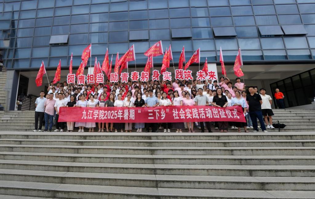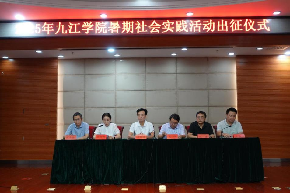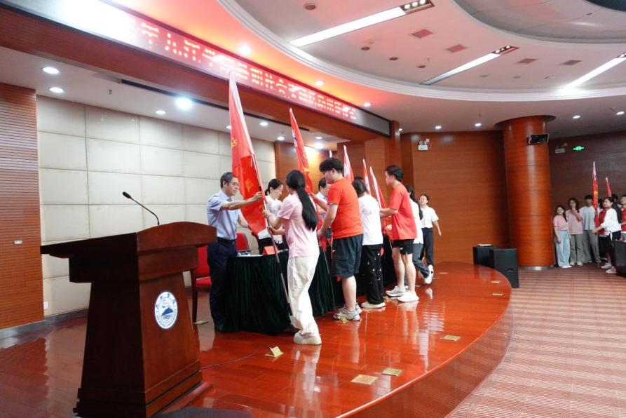 团委负责人介绍了2025年暑期社会实践的筹备情况;社会实践服务队指导教师代表谢彬作了经验分享;学生代表彭诗荣作了表态发言;与会领导为社会实践服务队进行授旗。
