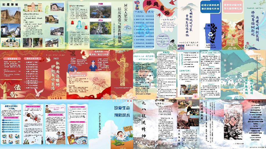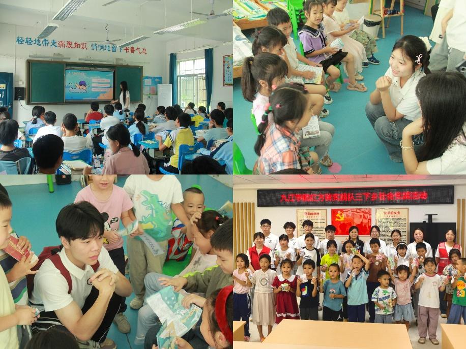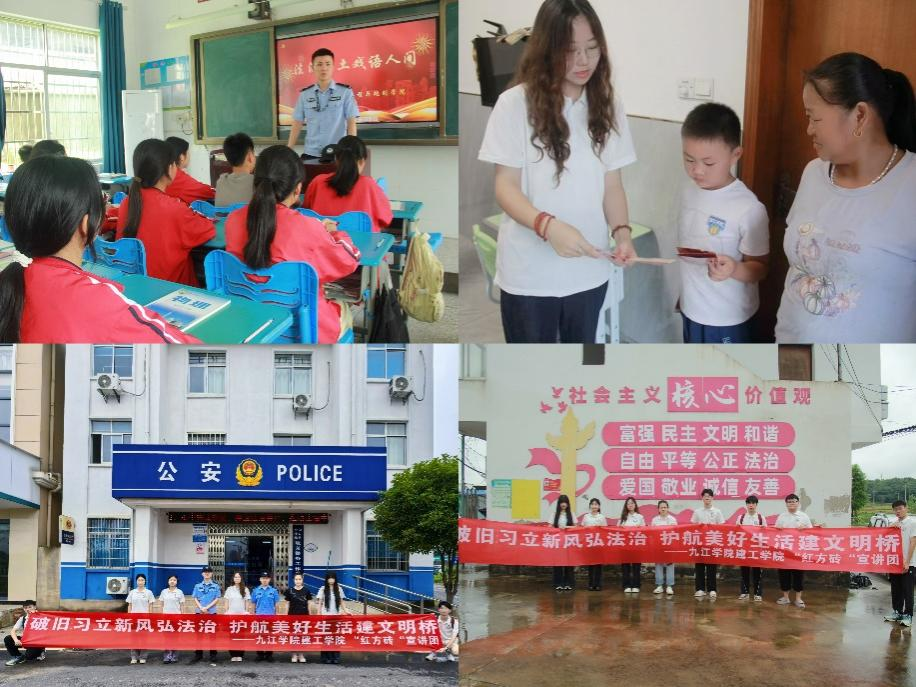 践行之旅聚焦民生,搭“服务之桥”。实践期间,队员们联合湖口流芳乡司法所开展“法治进乡村”,将法条转化为生活指南,以“纠纷处理三步法” 和七字普法口诀宣讲,发放图文手册;并深入赣州全南城厢镇等10余个村镇宣传移风易俗,对比案例讲文明乡风意义。在九江湖口流芳中学,队员们与当地民警一起开展“法治进校园”,构建教育链条;同时实践队也组织开展了 “守护生命桥”活动,校园外入户教村民防溺知识,校园内以案例和情景模拟教学生应急技能;为偏远地区留守儿童开展“心灵导航” 活动,搭建情感 “暖心桥”。