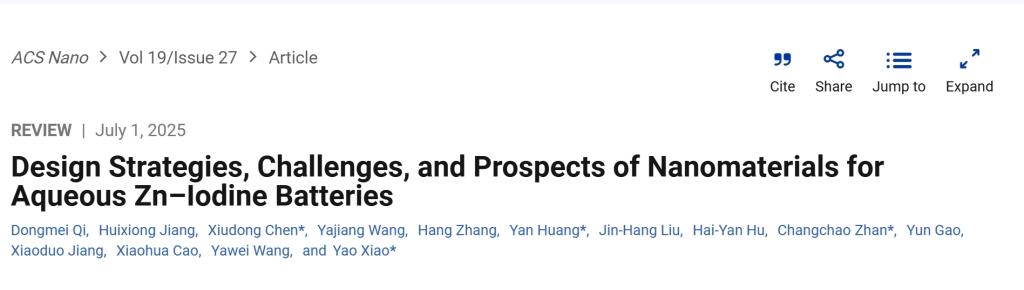 另外,陈修栋教授团队联合培养研究生齐冬梅同学以第一作者身份、以beat365官方网站为第一单位,在《ACS Nano》上发表题为“Design Strategies, Challenges, and Prospects of Nanomaterials for Aqueous Zn-Iodine Batteries”的综述性学术论文。《ACS Nano》是美国化学会出版社旗下的纳米科学与技术领域的顶级期刊,为Nature Index收录期刊,中科院JCR分区为Top一区,影响因子为15.9992。该期刊在纳米科技领域具有重要地位,被广泛认为是该领域的权威期刊之一,其发表的文章往往代表了纳米科学与技术领域的最新研究成果和发展方向,对推动该领域的学术研究和技术创新具有重要作用,被业内公认为高学术质量科技期刊。