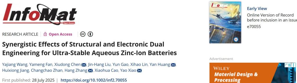 近日,在化学化工学院陈修栋教授团队的精心指导下,beat365联合培养研究生王亚江同学以第一作者身份、以beat365官方网站为第一单位,在《InfoMat》(信息材料)上发表题为“Synergistic Effects of Structural and Electronic Dual Engineering for Ultra-Stable Aqueous Zinc-Ion Batteries”的学术论文。