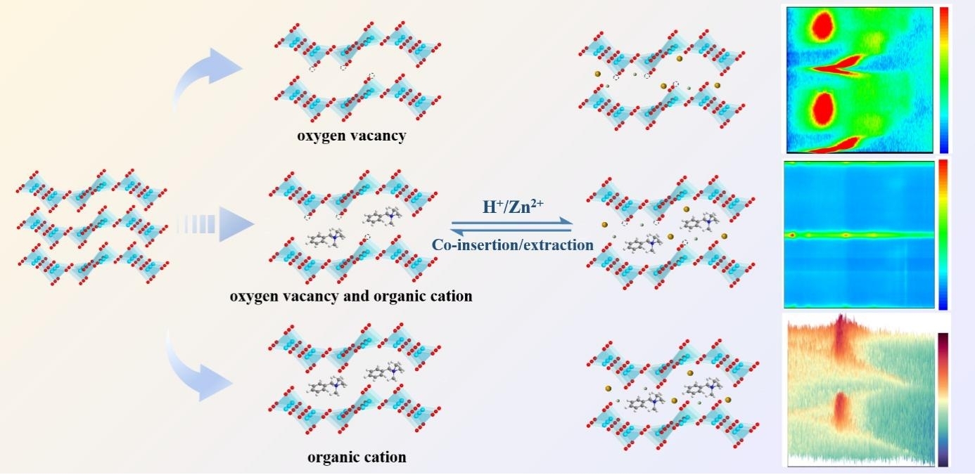 层状钒基氧化物因其理论容量高、钒元素多价态及成本低廉等优点,成为水系锌离子电池的一种有前途的正极材料。然而,层间距窄、结构不稳定等限制阻碍了其实际发展。针对这些挑战,我们通过一步水热法成功制备氧空位,并同时将苄基三甲基铵有机阳离子(TMBA+)插入V2O5层间距,得到VOH-TMBA⁺复合电极材料,实现了V2O5的双策略改性。在所得VOH-TMBA⁺中,氧空位和TMBA⁺协同作用,将层间距从6.84 Å扩展到13.8 Å,稳定了层状骨架,并调控了局域原子配位和电子结构。这种“结构-(-)电子”双重调控赋予VOH-TMBA⁺在0.2 A g-1电流密度下高达417.2 mAh g-1的比容量和优异的循环稳定性(在10.0 A g-1电流密度下循环7000次后容量保持率为90.7%)。原位XRD/Raman和非原位XPS/SEM表征表明VOH-TMBA⁺电极是一种基于H+/Zn2+共嵌入/脱出的储能机制。此外,密度泛函理论计算表明VOH-TMBA+的电导率进一步提高,而静电相互作用的降低有利于Zn2+的迁移。这项工作提供了一种通过协同结构和电子调控来设计层状金属氧化物的通用策略,为设计高性能水系锌离子电池正极材料提供了前景。(原文链接:https://onlinelibrary.wiley.com/doi/10.1002/inf2.70055)