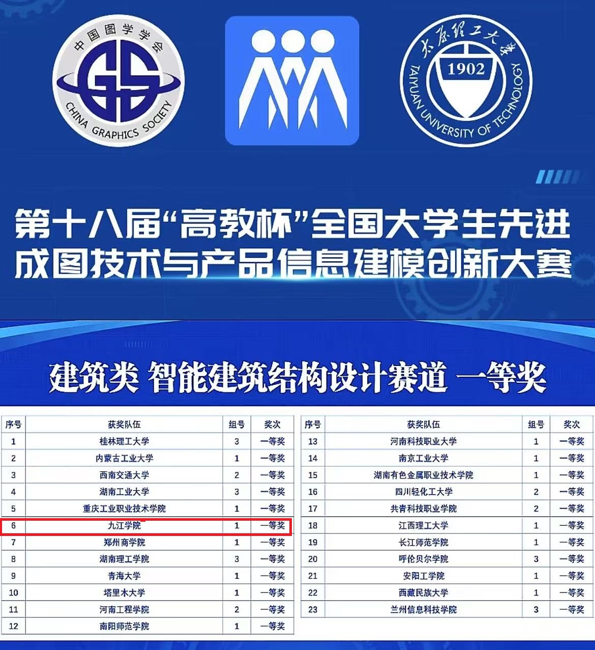 近日,第十八届“高教杯”全国大学生先进成图技术与产品信息建模创新大赛在太原理工大学圆满落幕。beat365建筑工程与规划学院学子获建筑类比赛全国一等奖2项、二等奖1项,三等奖8项,总分斩获国家团队二等奖!